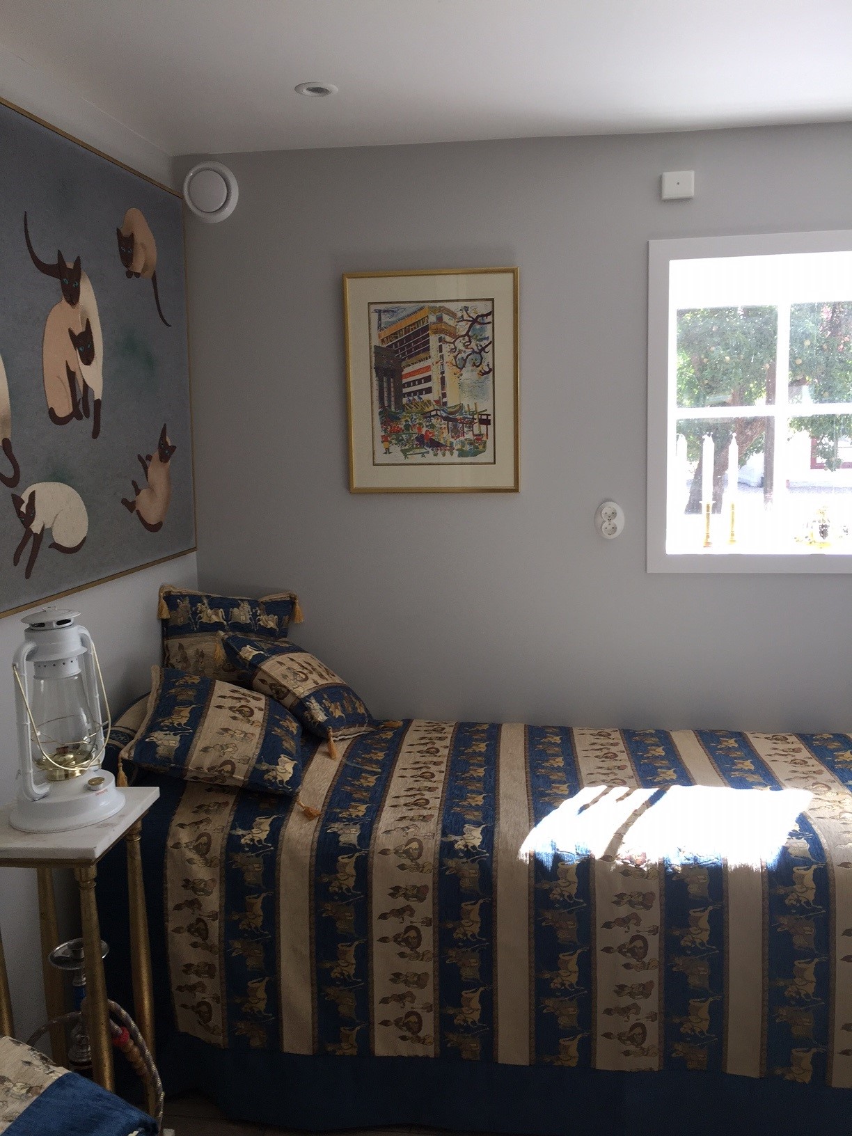 Detta söta lilla sovrum har ett eget handfat på rummet